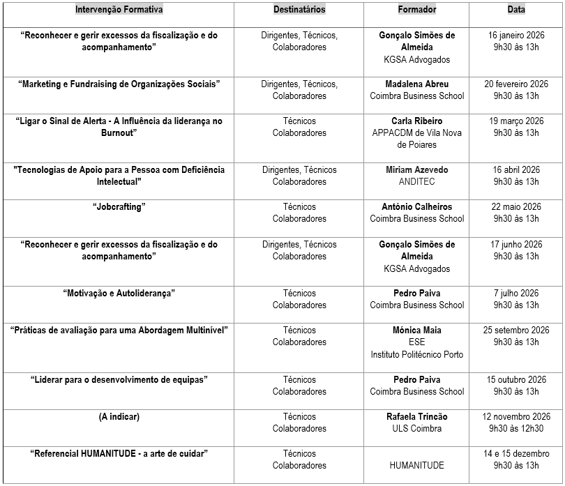 Os temas escolhidos pela Federação para as sessões formativas pretendem dar resposta às principais preocupações das nossas associadas e, de uma forma mais geral, de todas as organizações que apoiam pessoas com deficiência intelectual. Para tal, foi escolhido um conjunto de formadores que, quer pelo seu percurso técnico-científico, quer pela sua experiência profissional, acumularam um saber de excelência que deve ser partilhado entre nós. Por outro lado, e como se deduz facilmente, não pretende este plano ser exaustivo, mas sim um complemento importante para o plano formativo que cada associação deve construir para os seus colaboradores.